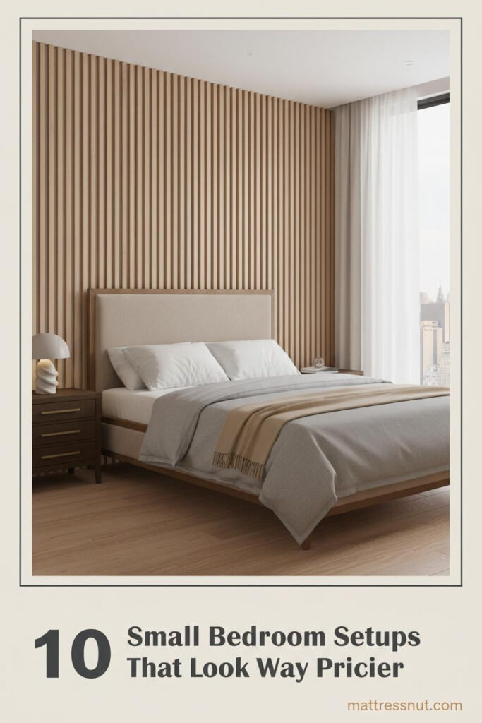 The finishing layer: Use a steel blue herringbone throw folded at the foot for the only real color contrast. One cool tone against all that warmth is enough. For finding the right bedside pieces to complete this kind of look, see these small nightstands for tight spaces that actually work at this scale.