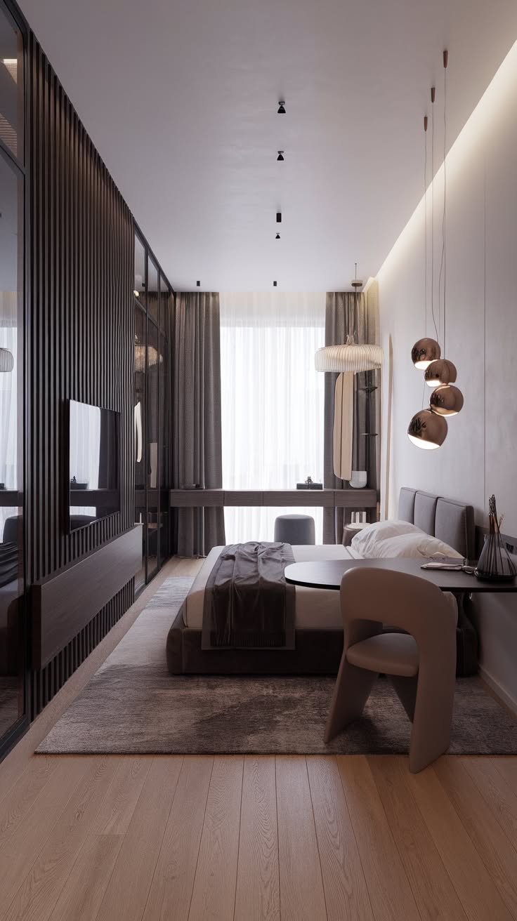 Modern pendant lighting fixtures create a sculptural element in this high-ceiling bedroom. The wall-mounted TV is perfectly integrated into a clean white wall, while the platform bed and curved chaise create comfortable viewing angles. The design emphasizes vertical space while maintaining a cozy atmosphere.