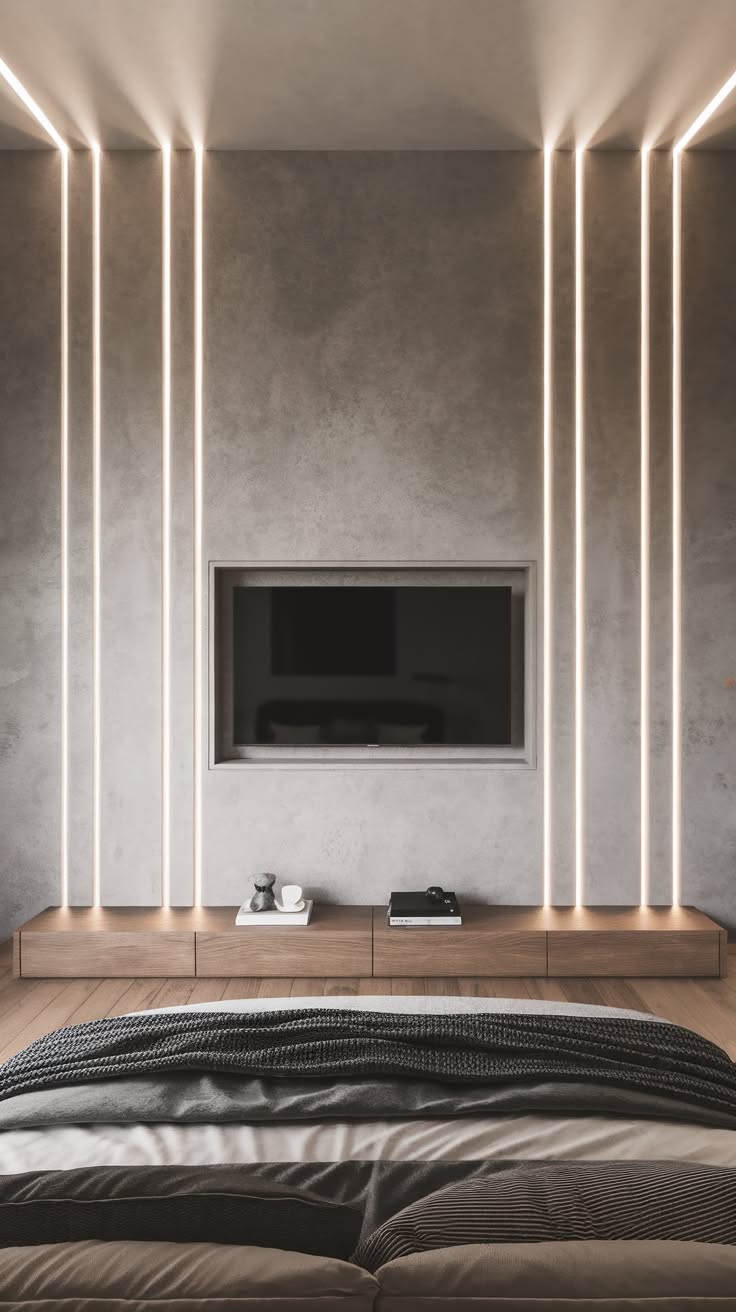 Elegant vertical LED strips create a rhythmic pattern around the wall-mounted TV. The concrete-finish panels provide a contemporary backdrop, while the floating wooden console adds warmth. The lighting design transforms the entire wall into an architectural feature.