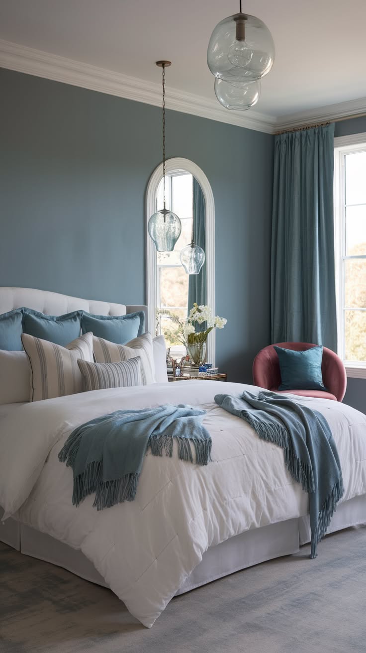 Discover a cozy blue retreat that embodies the essence of teal tranquility. The soft teal walls and white curtains create a soothing and inviting atmosphere, enveloping the space in a calming embrace. The plush white bedding and cozy throw pillows beckon one to sink into the comfort of the bed, surrounded by the gentle glow of the table lamp and the natural light streaming through the windows.