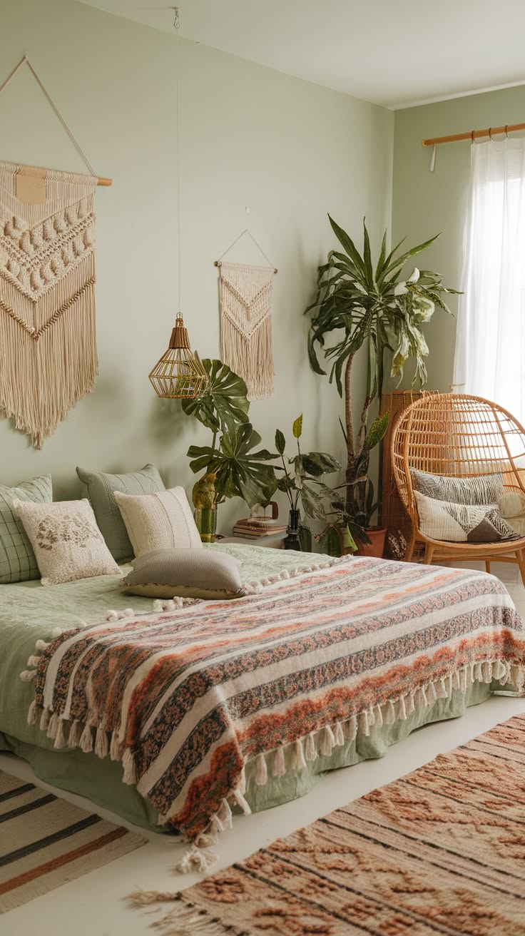 This bedroom embodies bohemian spirit with its sage green walls and eclectic mix of textures and patterns. The soft green hue creates a calming backdrop that allows the diverse decor elements to shine. A canopy bed draped in flowing fabrics serves as a dreamy focal point, inviting relaxation and romance. Layered textiles in various patterns and textures, from Moroccan-inspired rugs to embroidered pillows, add depth and visual interest. Macramé wall hangings and woven baskets bring natural textures to the space, enhancing the boho vibe. Plants in various sizes are scattered throughout, adding life and reinforcing the connection to nature. Vintage finds and global-inspired accessories contribute to the room’s collected, well-traveled feel. This design beautifully illustrates how a gentle green color palette can serve as the perfect foundation for a free-spirited, bohemian bedroom retreat.