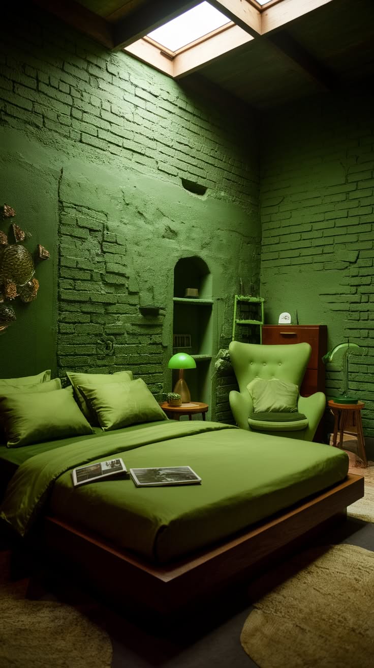 This bedroom combines industrial elements with a rich green color scheme for a unique and stylish look. The walls feature a deep forest green that adds warmth to the typically cool industrial aesthetic. Exposed brick walls and metal piping embrace the raw, unfinished look characteristic of industrial design. A sleek metal bed frame serves as a focal point, its simplicity allowing the green walls to shine. Edison bulb pendant lights add vintage charm while providing warm illumination. Concrete floors and metal accents further enhance the industrial vibe. Lush green plants soften the hard edges and tie into the room’s color scheme. This design masterfully demonstrates how a bold green color palette can soften and elevate an industrial-inspired bedroom, creating a space that’s both edgy and inviting.