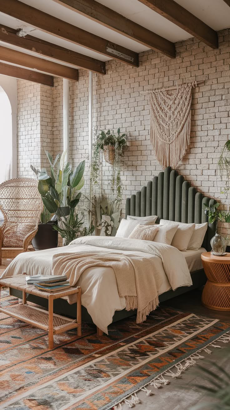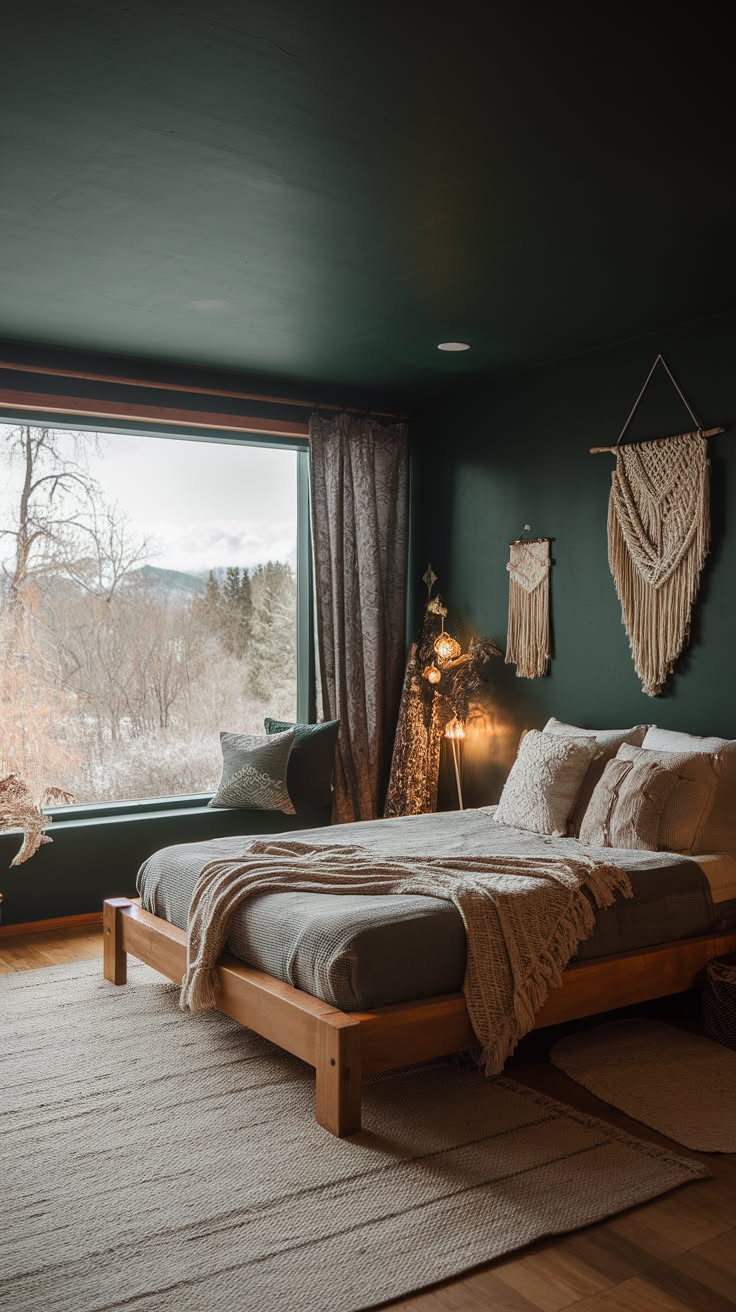This bedroom embodies a bohemian spirit with its rich green walls and eclectic decor. The deep teal-green color creates a cozy, enveloping atmosphere that serves as a perfect backdrop for the diverse textures and patterns. A wrought iron bed frame adds a vintage touch, dressed in layers of patterned textiles in warm earthy tones. Macramé wall hangings and woven baskets bring natural textures to the space, enhancing the boho vibe. Plants in various sizes are scattered throughout, adding life and reinforcing the connection to nature. Rattan furniture pieces and wooden accents contribute warmth and organic elements to the room. This design beautifully showcases how a green color palette can be the foundation for a vibrant, personality-filled bohemian bedroom.
