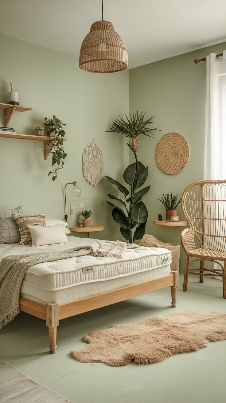 This bedroom embraces natural elements with its soft green walls and organic textures. The pale sage green color creates a calming backdrop that evokes the tranquility of nature. A simple wooden bed frame anchors the space, its natural grain adding warmth and character. Layers of cozy bedding in neutral tones invite relaxation, while green accent pillows tie into the room’s color scheme. Woven baskets and a jute rug introduce natural textures, enhancing the room’s earthy feel. Potted plants are scattered throughout, bringing life to the space and reinforcing the connection to the outdoors. Large windows allow ample natural light, further blurring the lines between indoors and out. This design beautifully illustrates how a subtle green palette can create a serene, nature-inspired bedroom retreat.