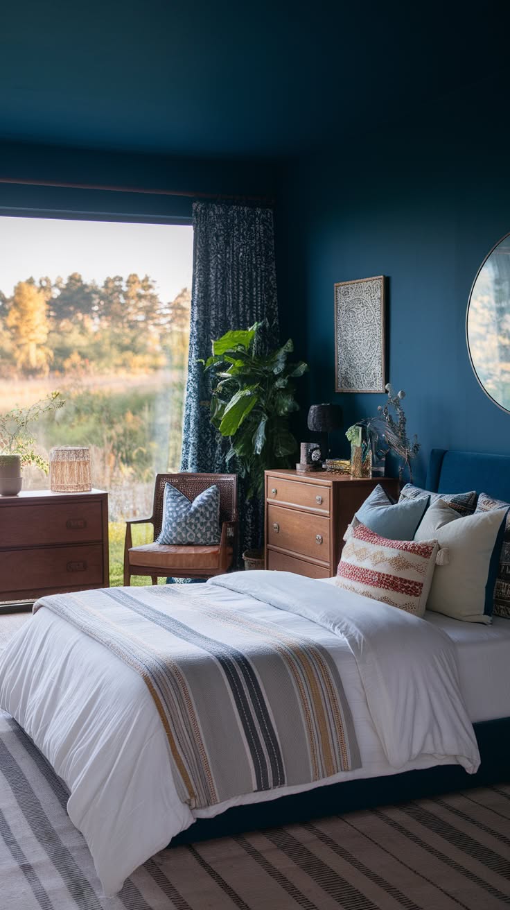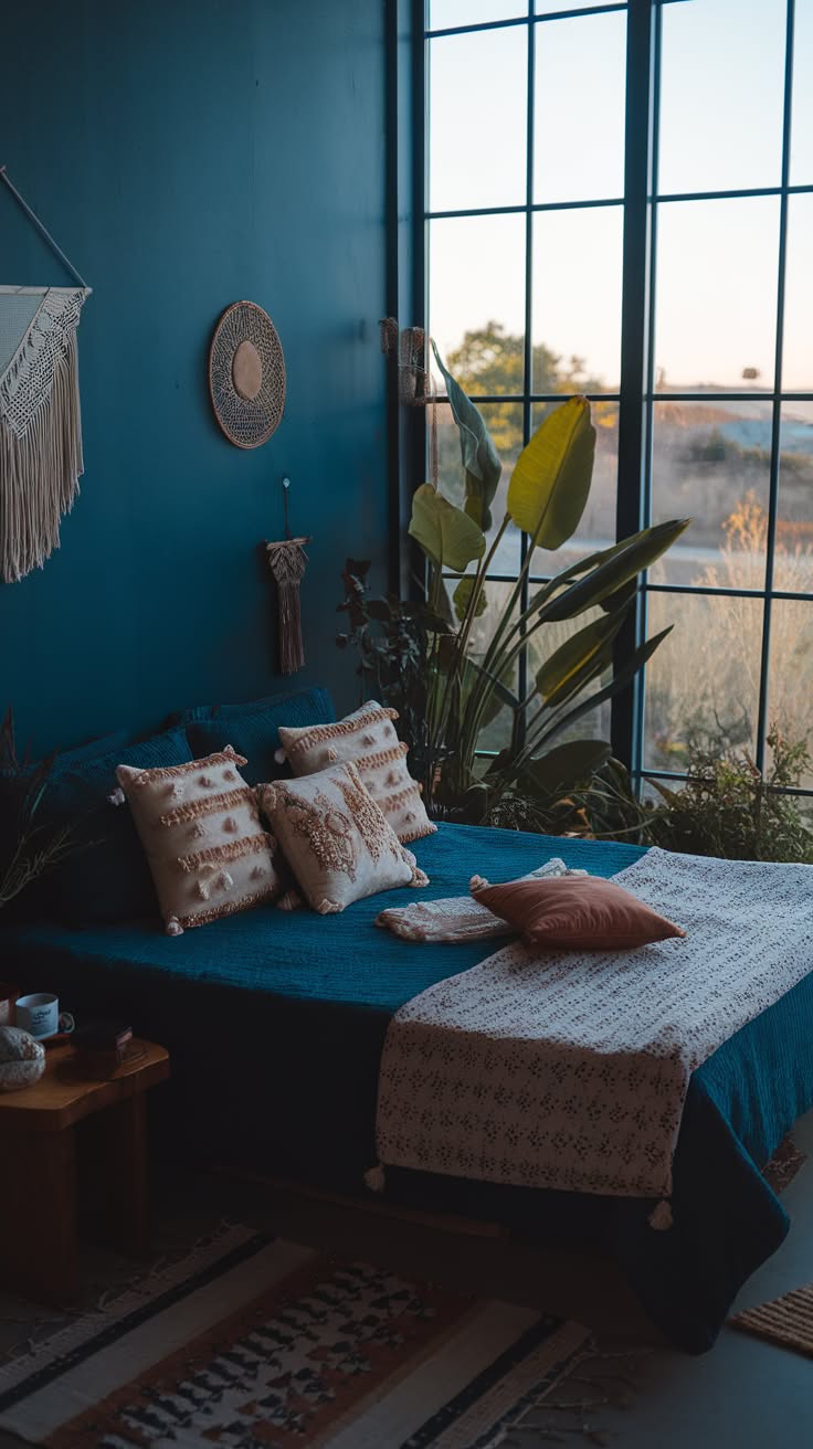 This bedroom embraces a bohemian-inspired dark blue theme with eclectic charm. The deep teal walls create a serene backdrop for an array of textures and natural elements. Hanging plants and macramé decor add a whimsical, organic touch to the space. The bed is adorned with patterned textiles in complementary blue tones, creating a layered, cozy look. A large window floods the room with natural light, highlighting the richness of the wall color. Wooden accents and woven decor pieces bring warmth to the cool blue palette, resulting in a balanced and inviting atmosphere.