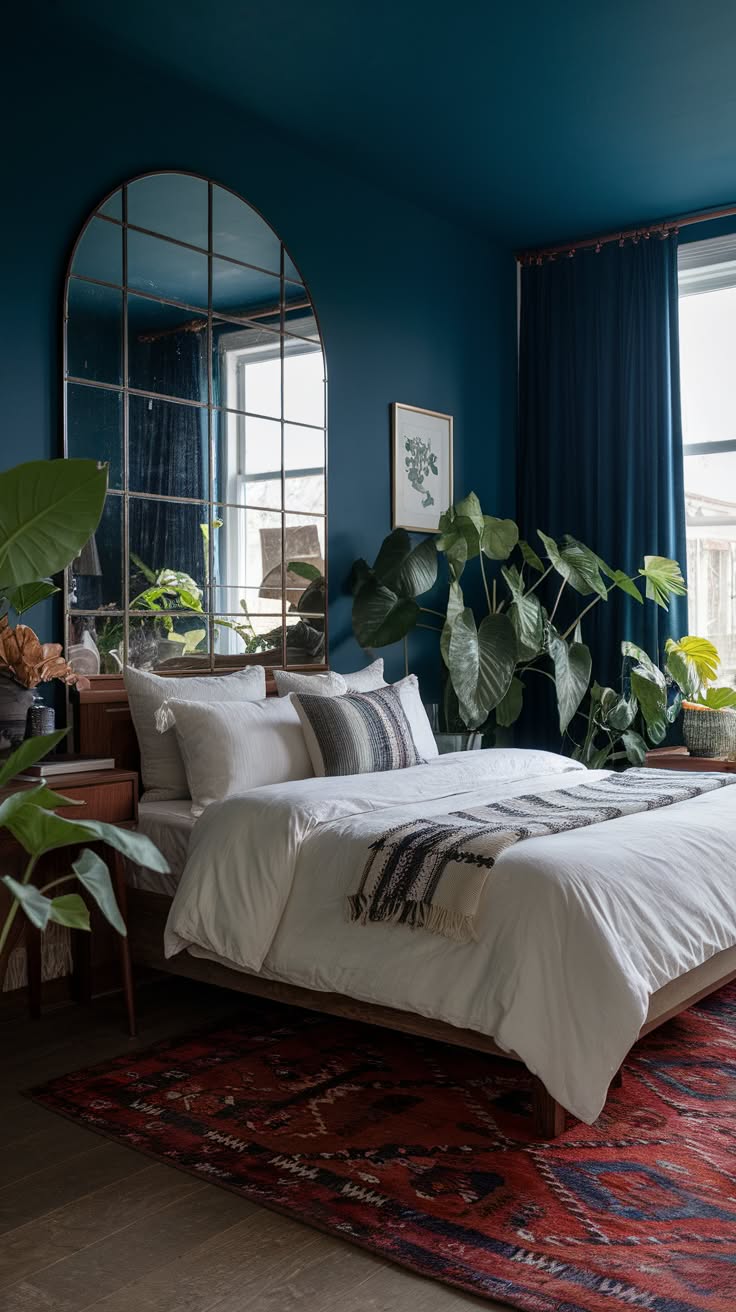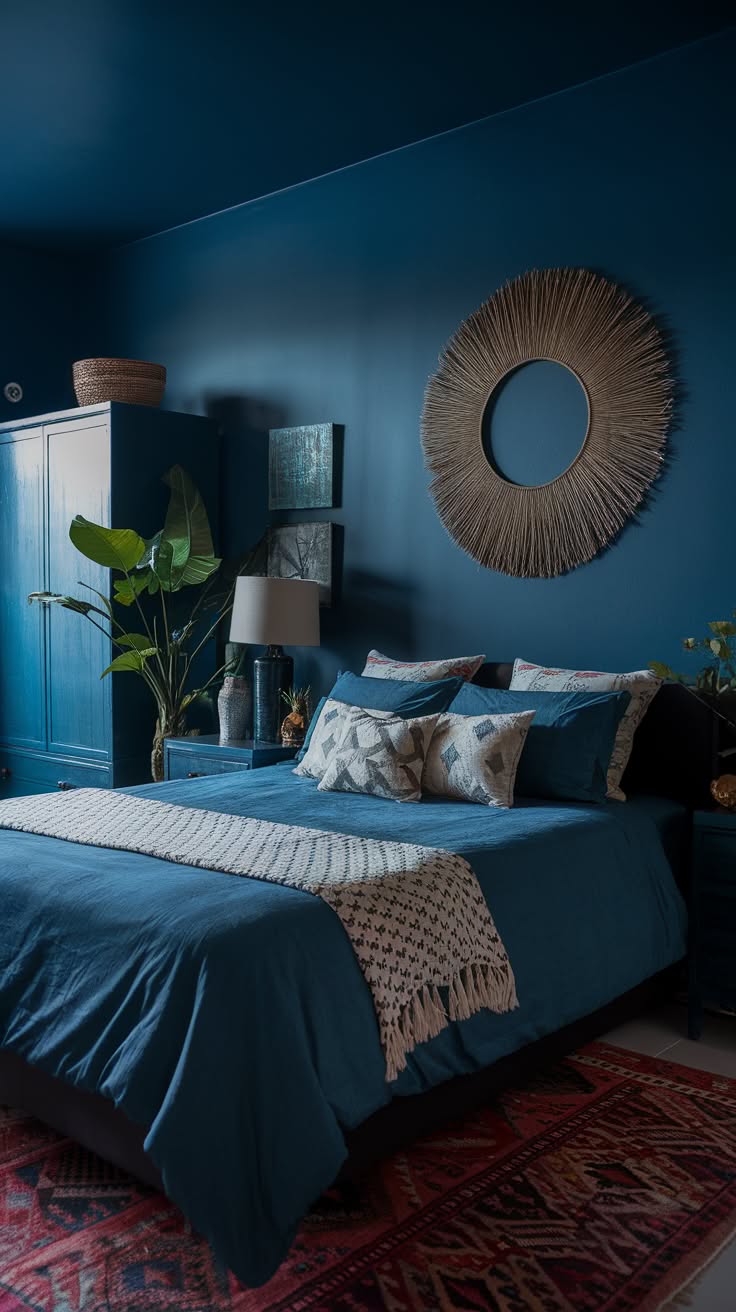 This bedroom celebrates individuality with its eclectic mix of styles set against a dark blue backdrop. The deep teal walls provide a rich canvas for an array of textures, patterns, and global-inspired decor. A uniquely shaped bed with colorful textiles adds character and serves as a focal point. Plants and natural elements bring life and organic shapes to the space. Artwork and accessories in various styles create visual interest and tell a personal story. The combination of dark blue walls with vibrant accents results in a unique and expressive bedroom that feels both cozy and adventurous. This design proves that dark blue can be a versatile backdrop for showcasing personal style and collected treasures.