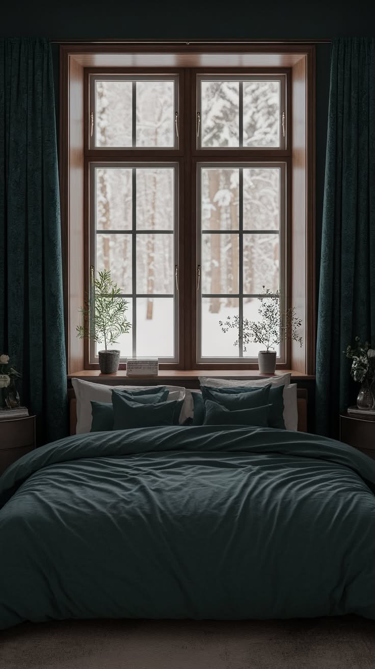 This bedroom is a perfect blend of rustic charm and modern comfort, all set against a backdrop of deep forest green. The standout feature is the large picture window offering breathtaking mountain views, seamlessly connecting the interior with the natural landscape outside. Exposed wooden beams on the ceiling add warmth and character, complementing the rich green walls. The bed, dressed in layers of cozy textiles in earthy tones, invites relaxation. A modern armchair by the window creates a perfect reading nook to enjoy the view. Plants scattered throughout the room reinforce the connection to nature. This space beautifully demonstrates how dark green can create a cozy, cabin-like atmosphere while maintaining a fresh, contemporary feel.
