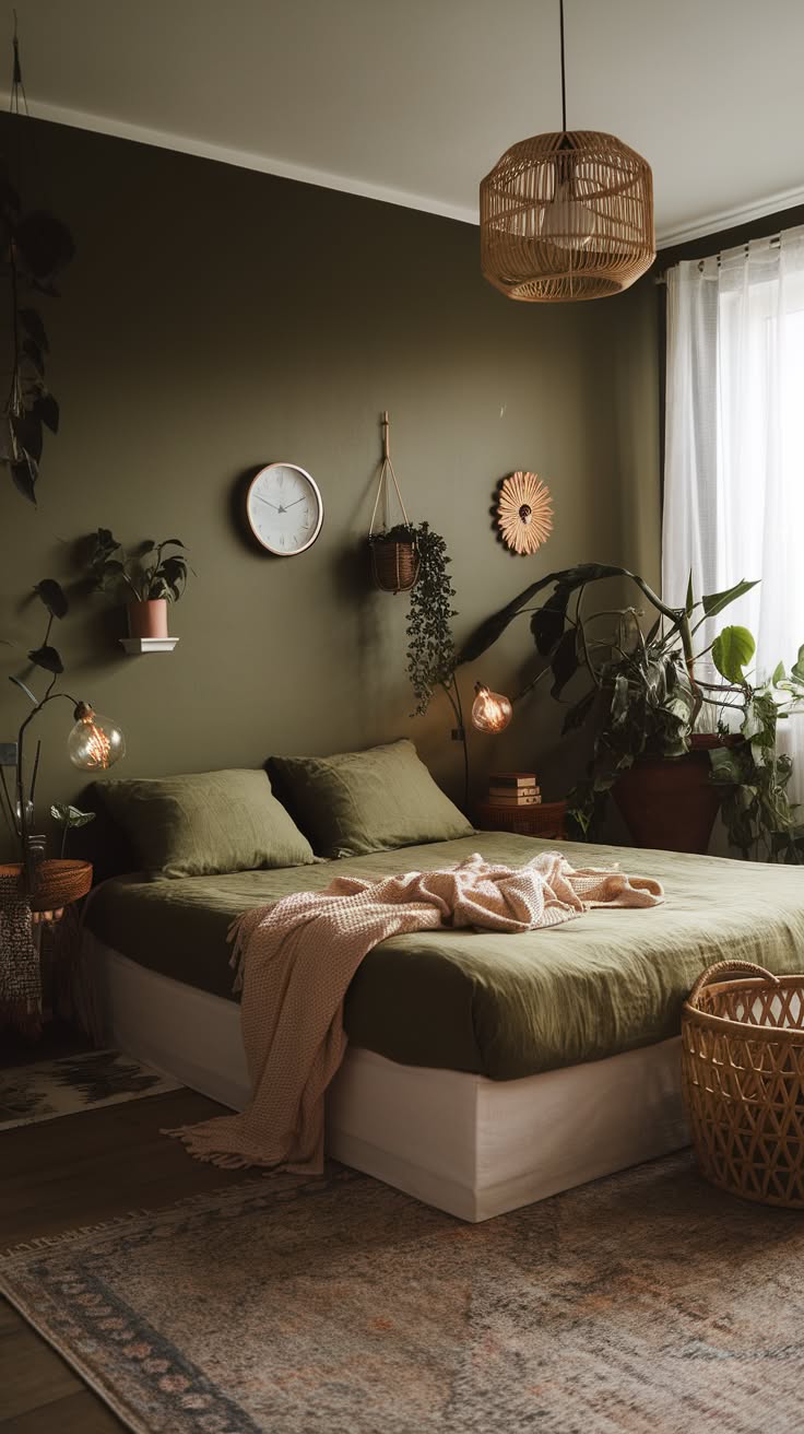 This bedroom is a vibrant celebration of bohemian style set against a backdrop of rich, dark green. The space is filled with an eclectic mix of patterns, textures, and colors that create a lively, personal atmosphere. The focal point is the bed, adorned with an array of pillows in various prints and a cozy patterned throw. A statement pendant light adds a modern touch and casts a warm glow. Plants of different sizes bring life and reinforce the nature-inspired theme. Woven wall hangings and a colorful area rug add layers of texture and interest. This room showcases how dark green walls can serve as a perfect canvas for expressing individual style and creating a cozy, free-spirited retreat.