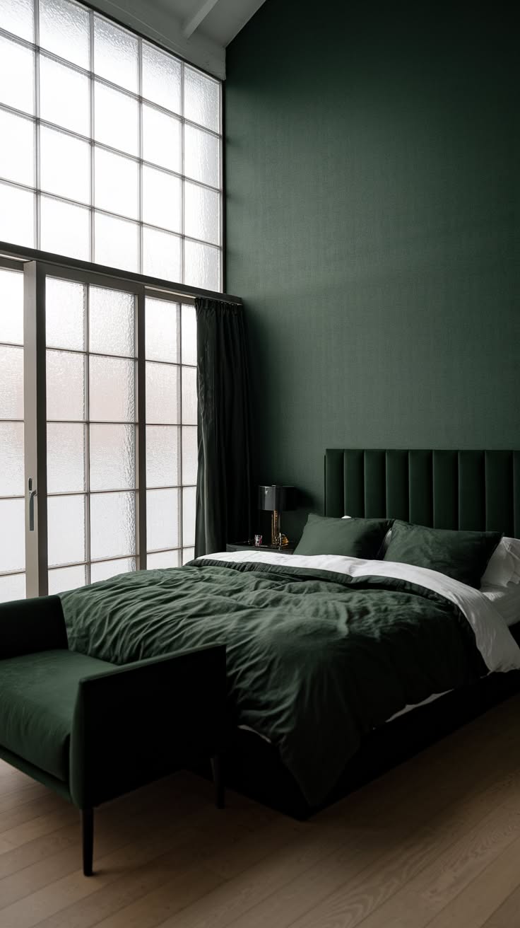 This bedroom embodies modern minimalism with its dark green walls and clean, streamlined design. The space is dominated by large windows that flood the room with natural light, creating a beautiful interplay with the deep green hues. The bed, with its simple frame and crisp white linens, stands out against the dark backdrop. A few carefully chosen pieces of furniture in sleek, modern designs add functionality without cluttering the space. The addition of a single, architectural plant brings a touch of organic shape to the geometric lines. This room demonstrates how dark green can create a calm, focused environment perfect for rest and relaxation, while still maintaining a contemporary, minimalist appeal.