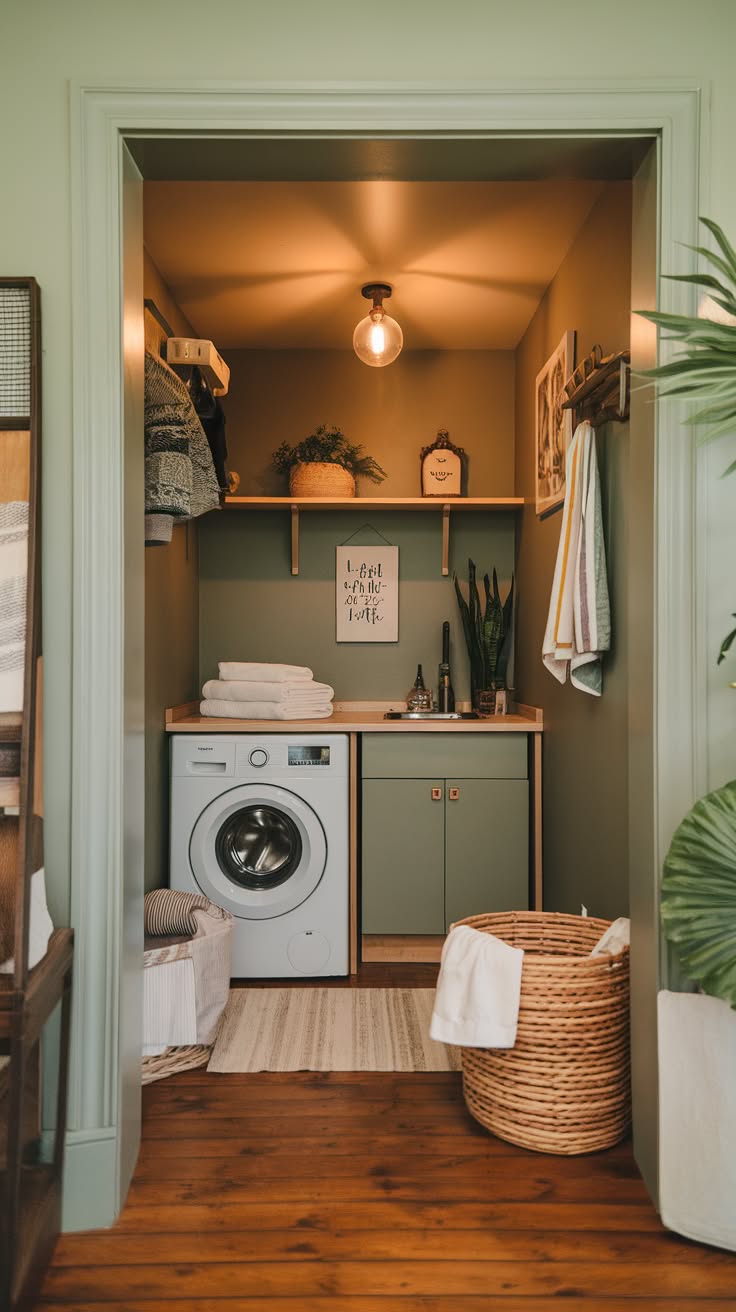 This laundry room merges Scandinavian simplicity with bohemian flair, featuring sage green walls and natural textures. Woven baskets, macramé wall hangings, and potted plants add warmth to the clean, minimalist base. The space demonstrates how different design styles can be harmoniously combined to create a unique and inviting laundry area.