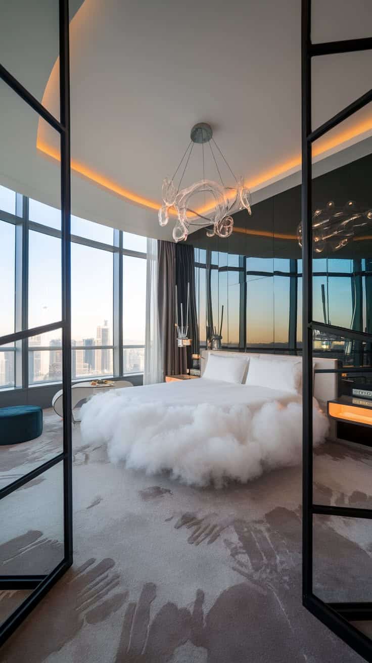 This sophisticated bedroom is anchored by a stunning cascading chandelier that adds drama and elegance overhead. The chandelier’s unique shape is echoed in the room’s other curved elements, like the tufted headboard and ottoman. A palette of soft neutrals and metallics creates a soothing yet glamorous atmosphere. Mirrored nightstands reflect the light and add a touch of sparkle.