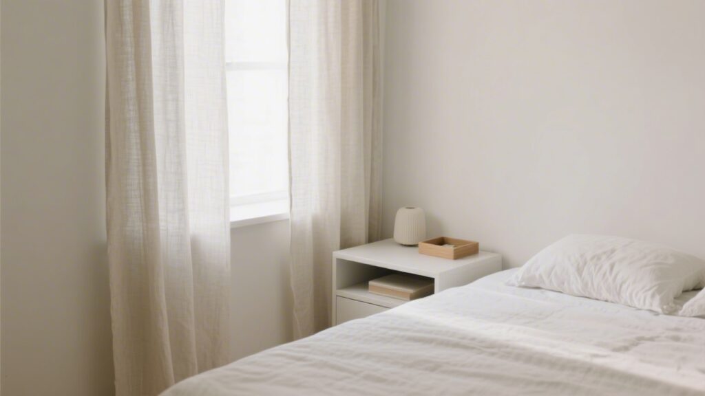 Laptops, documents, work bags, and anything associated with task completion activate goal-directed thinking — the opposite of the quiet mind needed for sleep. If your bedroom doubles as a home office, use a visual separator (room divider, curtain, or at minimum a closed laptop bag) to remove work cues from your sleeping field of view.