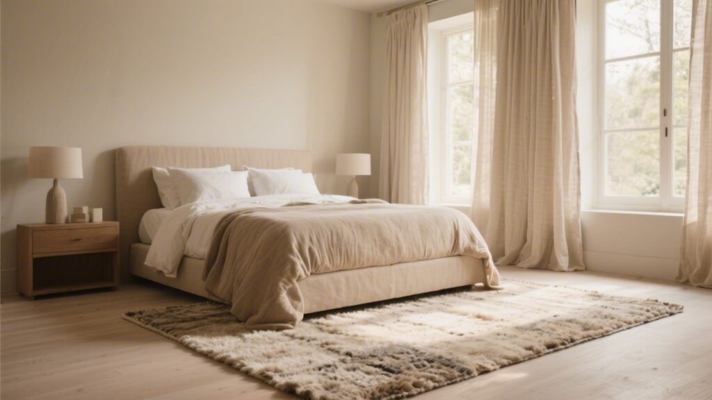 A bedroom rug is not primarily a decorative element — it is an acoustic, thermal, and psychological intervention. Bedrooms without rugs have longer reverberation times, colder floor temperatures in the morning, and less defined spatial boundaries. All three of these factors affect sleep quality directly or indirectly.