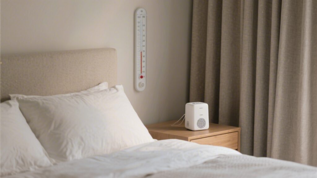 Target: 65-68°F (18-20°C). Test: Run your thermostat at the target for two weeks and track sleep quality. Signs of too-warm sleeping: frequent waking, sweating, kicking off covers. Signs of too-cold: difficulty falling asleep, muscle tension, frequent waking to add covers.