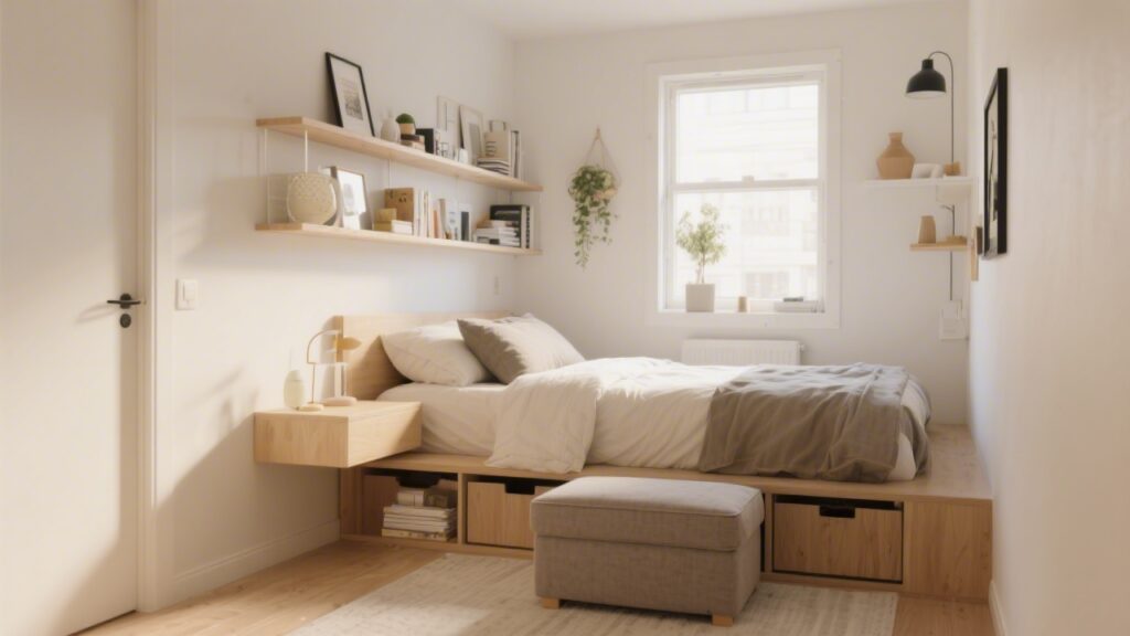 Vertical storage is the highest-impact approach in small bedrooms: floating shelves above the bed, tall wardrobes to ceiling height, and over-door organizers use wall space instead of floor space. Dual-purpose furniture (storage bed, storage ottoman, storage bench at the foot of the bed) eliminates the need for additional freestanding pieces.