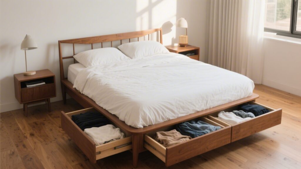 A bed frame with built-in drawers solves the under-bed chaos problem without requiring extra furniture. Folded clothing, spare bedding, and seasonal items stay organized, accessible, and protected from dust — inside the bed itself.