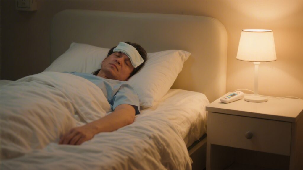 Hydration before sleep. Fever increases insensible fluid loss through sweating and increased respiratory rate. Drinking 8–12 oz of water or a dilute electrolyte solution before bed reduces the severity of dehydration that compounds overnight discomfort.