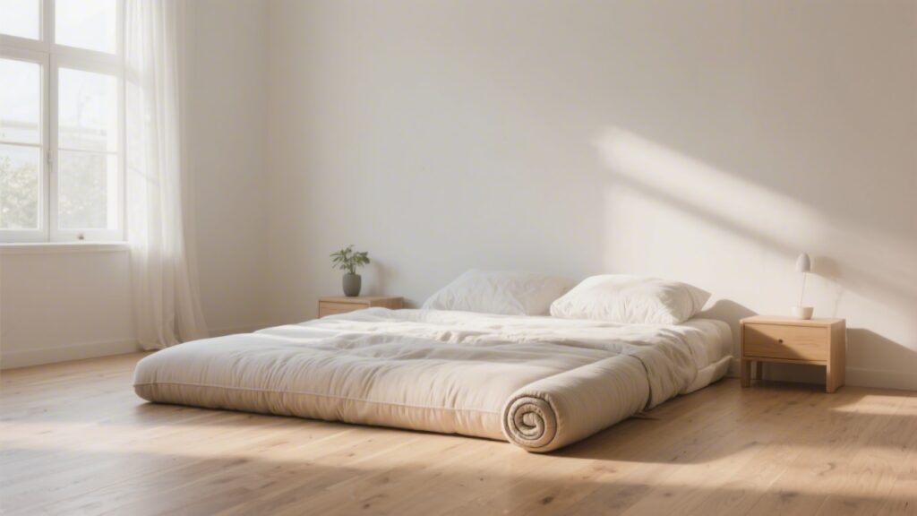 - Use a firm mat or futon — A 2-4 inch firm cotton or wool futon provides insulation from the cold floor and reduces pressure without adding significant softness. See our Japanese floor bed guide for details on this system.
