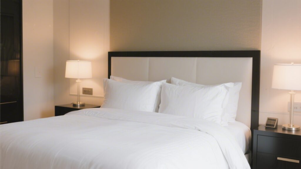 - Hotels optimize for sleep using a complete system: medium-firm hybrid mattresses, layered bedding, high-thread-count percale sheets, multiple pillow options, and blackout curtains. Home sleep usually lacks 2–3 of these elements.