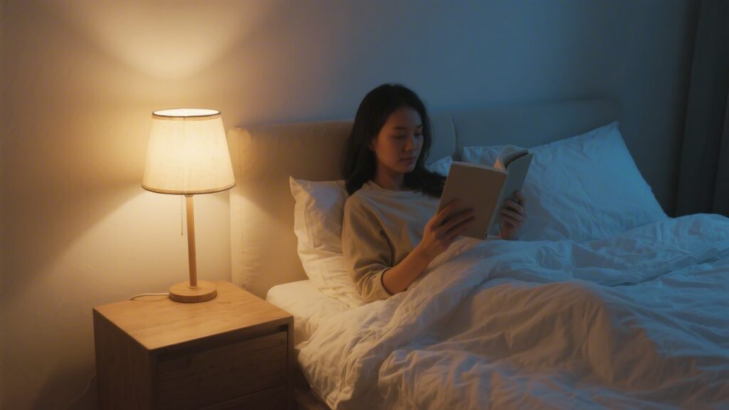 Begin dimming lights in your home 90 minutes before bed. Use warm, low-color-temperature bulbs (2700K or below) in the evening. Bright overhead lighting suppresses melatonin production — a physiological signal that it is still daytime. Candles or dim floor lamps create a natural light environment analogous to dusk.