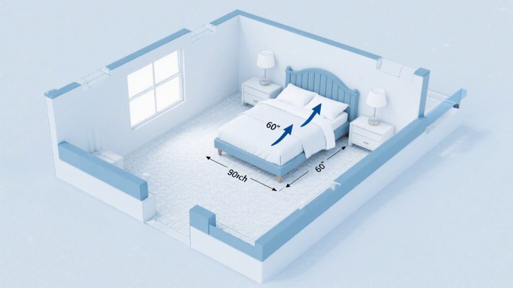 This is why the practical minimum room width for a queen bed with comfortable clearance is 10 feet — it gives you approximately 36 inches of walking space distributed across both sides. A 9-foot-wide room technically fits the bed but leaves tight circulation. For the complete room planning breakdown, see our queen mattress dimensions guide.