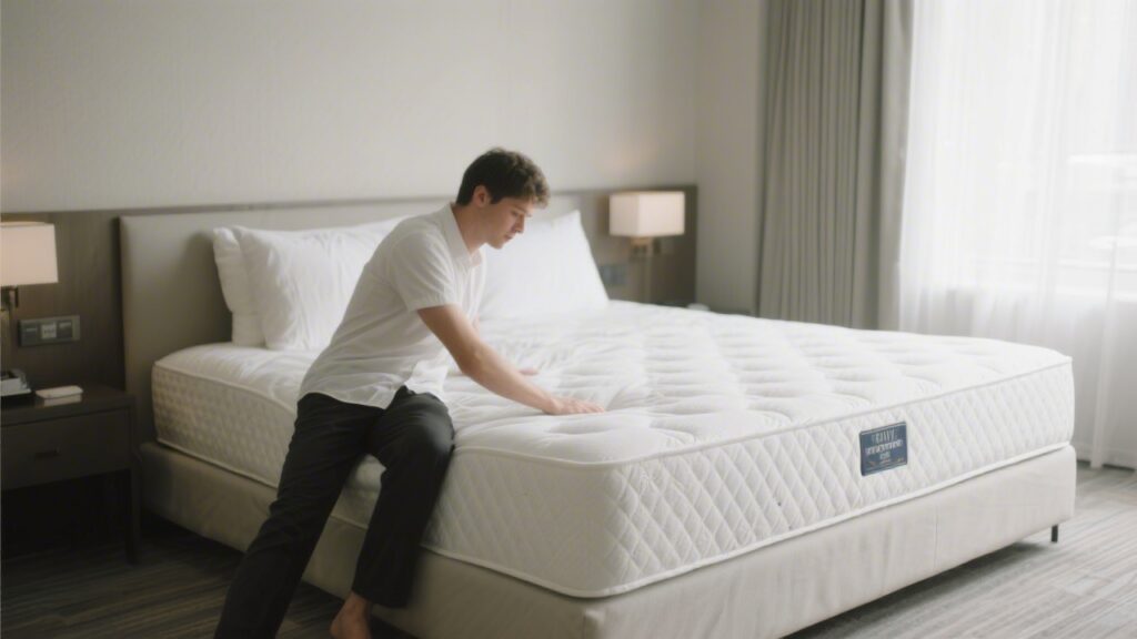 Sit on the edge of the mattress with your full body weight. A mattress with good edge support should compress no more than 2–3 inches under seated pressure. More than 4 inches of compression, or a feeling that you might roll off, indicates weak edge support.
