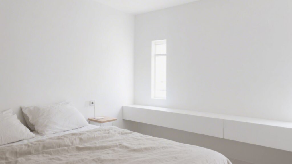 Visual clutter is a measurable enemy of sleep. Neuroscience research from Princeton University found that visual inputs compete for neural resources, and environments with multiple competing visual elements require ongoing low-level cortical activity — a state incompatible with sleep onset. A minimalist bedroom — defined as fewer than seven visible surfaces from the sleeping position — reduced self-reported sleep onset time by an average of 18 minutes in a UK residential design study. This is not aesthetic preference. It is cognitive load management.