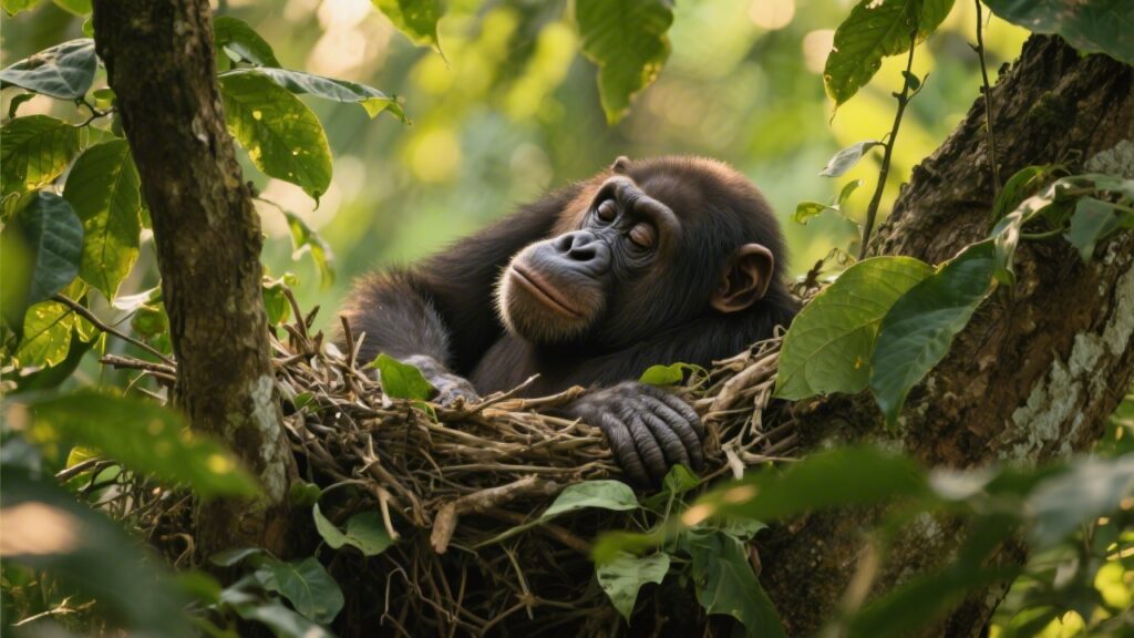 Great apes (chimpanzees, bonobos, gorillas, and orangutans) consistently build sleeping platforms — branch and leaf nests in trees — for every sleep period. This investment of daily time and energy is maintained throughout their lives. When researchers analyzed chimp nest structure, they found it optimized for spinal support and pressure distribution: flexible branches providing conforming support, layered leaves providing cushioning, elevated position providing safety and thermoregulation.
