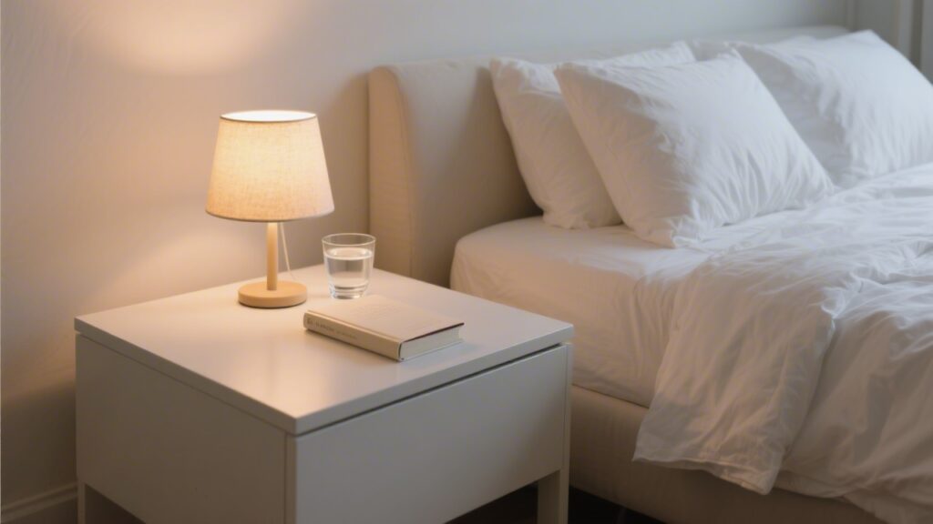 The most important nightstand item after water. Warm light (2700K or below) for 30-60 minutes before sleep signals melatonin production. Replace overhead ceiling lights with a nightstand lamp in the final hour before bed. Smart bulbs that auto-dim to 10% brightness at a set time are worth the modest investment.