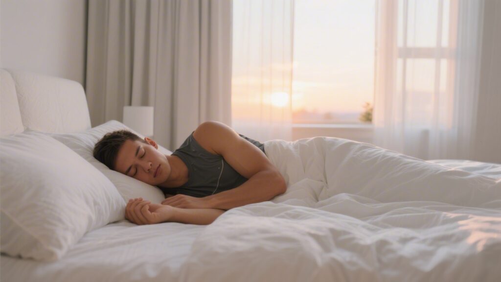 Protein timing for overnight synthesis. A moderate protein meal (casein or mixed protein) within two hours of bed provides amino acid availability during the overnight GH-driven synthesis window. Studies show 40g of casein protein before bed increases next-morning muscle protein synthesis rates without disrupting sleep quality.