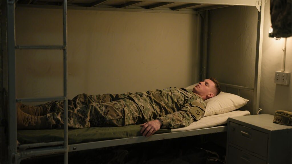 Combat deployments add environmental stressors: hypervigilance triggered by threat environments suppresses the parasympathetic activity required to initiate sleep, even when the tactical situation permits rest. Service members describe lying in their rack unable to disengage the threat-monitoring state — a physiological reality rooted in elevated cortisol and norepinephrine levels that persist for hours after stand-down.