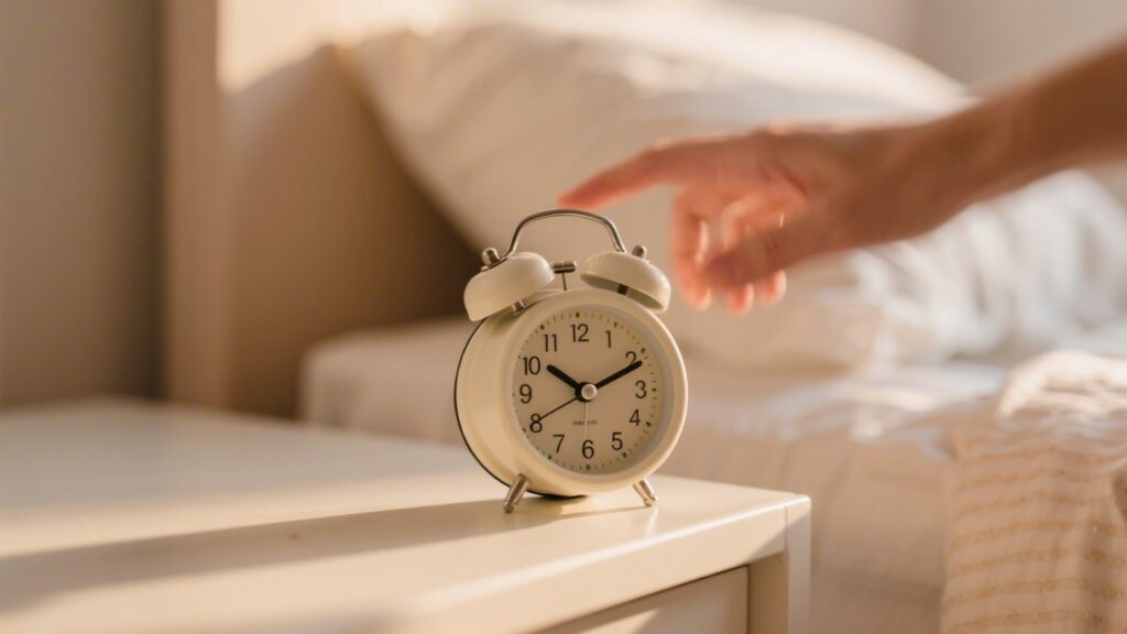 - Two-alarm method — set alarm 20 minutes before required wake, then a hard deadline alarm. The first alarm gives you the choice to stretch the final light-sleep period; the second is non-negotiable