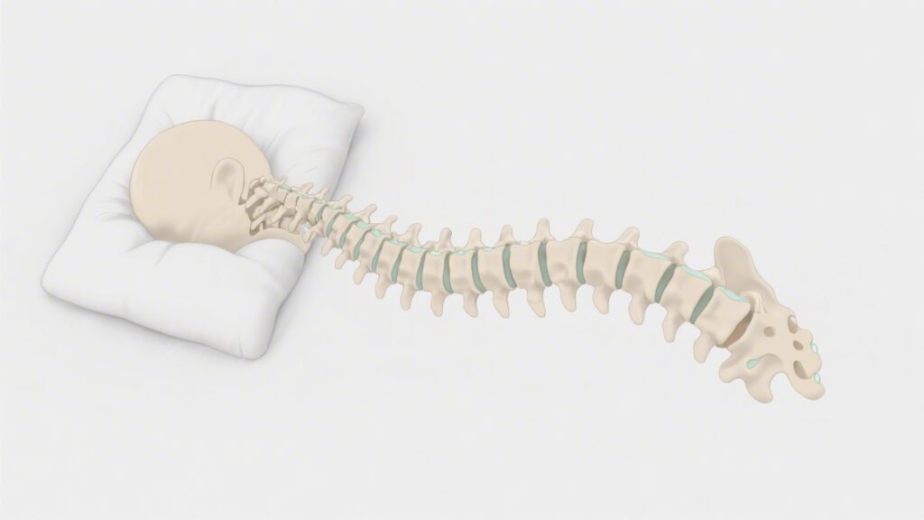 The cervical spine is the most frequently neglected segment. For back sleepers, a low-to-medium loft pillow maintains the cervical lordosis without pushing the head into flexion. For side sleepers, pillow loft must equal the distance between the ear and the mattress surface — which is the shoulder width. For stomach sleepers, no pillow or a very flat pillow is least harmful.