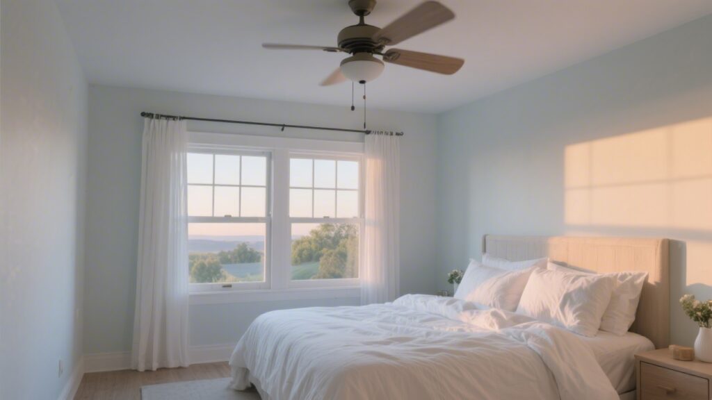 A fan helps through two mechanisms: circulating air creates evaporative cooling on skin, and the consistent white noise masks outdoor summer sounds (traffic, birds, outdoor activities). A ceiling fan on low produces both benefits without the direct airflow that can dry out airways.