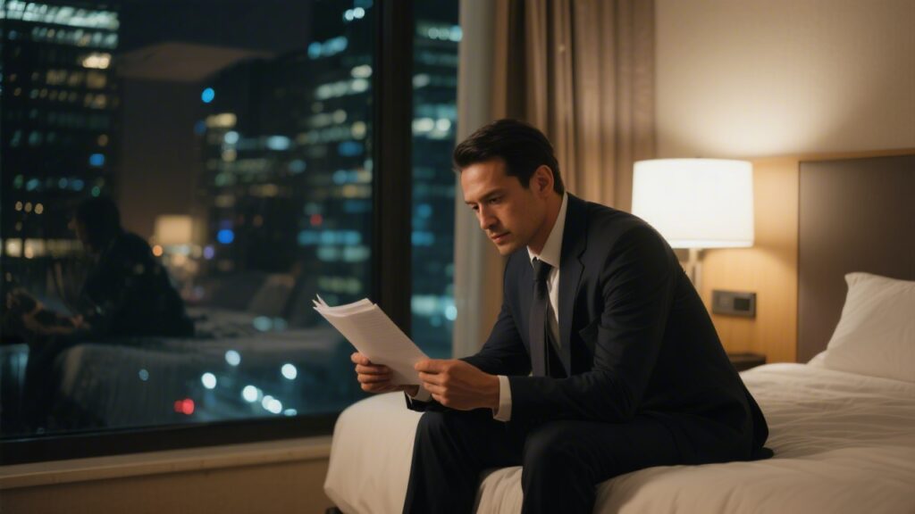Business hotels are not designed for sleep. Standard issues: light bleed under door frames, HVAC noise, temperature presets at 70–72°F (too warm), and blackout curtains that don't fully close. Your protocol: