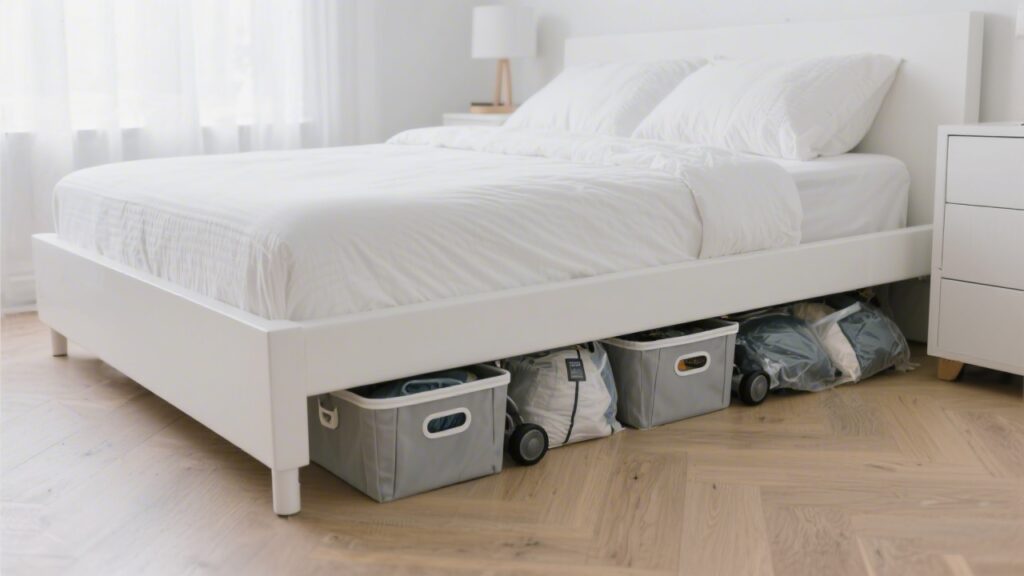 Flat rolling bins with lids (4-6 inches tall) work best for standard platform beds. For beds with 8-10 inch clearance, shallow stackable boxes work. Vacuum storage bags are excellent for compressible items like comforters and seasonal clothing — they reduce volume by 75% and seal against dust and moisture.